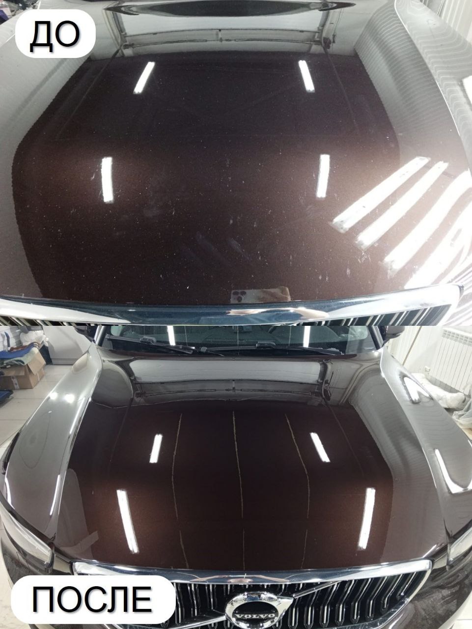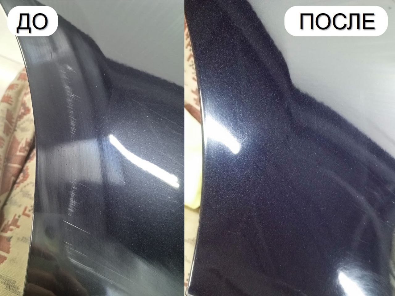 Восстановление геометрии детали (например, стертое ребро). Полное удаление пескоструя, сколов с капота. Полный детейлинг автомобиля от дефектов.